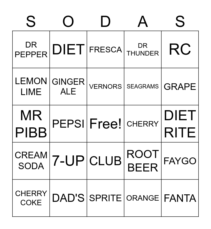 This bingo card has a free space and 31 words: SPRITE, COKE, PEPSI, MOUNTAIN DEW, DR PEPPER, FRESCA, GINGER ALE, ROOT BEER, CHERRY, ORANGE, DIET RITE, FANTA, CRUSH, A & W, GRAPE, STRAWBERRY, FAYGO, 7-UP, CREAM SODA, CLUB, RC, MELLO YELLO, CHERRY COKE, DIET, SEAGRAMS, LEMON LIME, DR THUNDER, MR PIBB, DAD'S, VERNORS and SQUIRT.