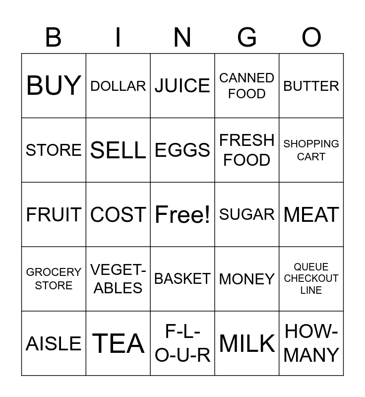 This bingo card has 29 images, a free space and 29 words: AISLE, CHOCOLATE, COST, BREAD, BUY, JUICE, SELL, VEGET-ABLES, SUGAR, TEA, MEAT, HOW-MANY, F-L-O-U-R, MILK, SHOPPING CART, FISH, BASKET, GROCERY STORE, BUTTER, FRUIT, MONEY, PRICE, FRESH FOOD, STORE, CANNED FOOD, DOLLAR, QUEUE CHECKOUT LINE, EGGS and BAG.