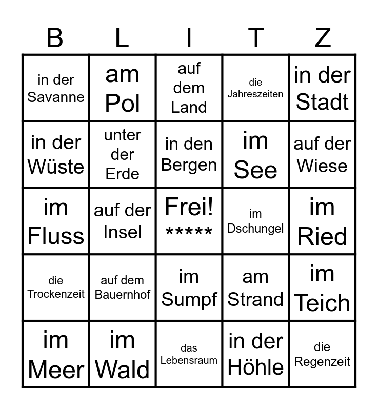 This bingo card has a free space and 24 words: auf dem Bauernhof, im Wald, in den Bergen, im Meer, in der Stadt, in der Savanne, in der Wüste, am Pol, im Dschungel, im Sumpf, im See, im Fluss, am Strand, im Teich, unter der Erde, in der Höhle, im Ried, auf dem Land, auf der Wiese, auf der Insel, die Regenzeit, die Trockenzeit, die Jahreszeiten and das Lebensraum.