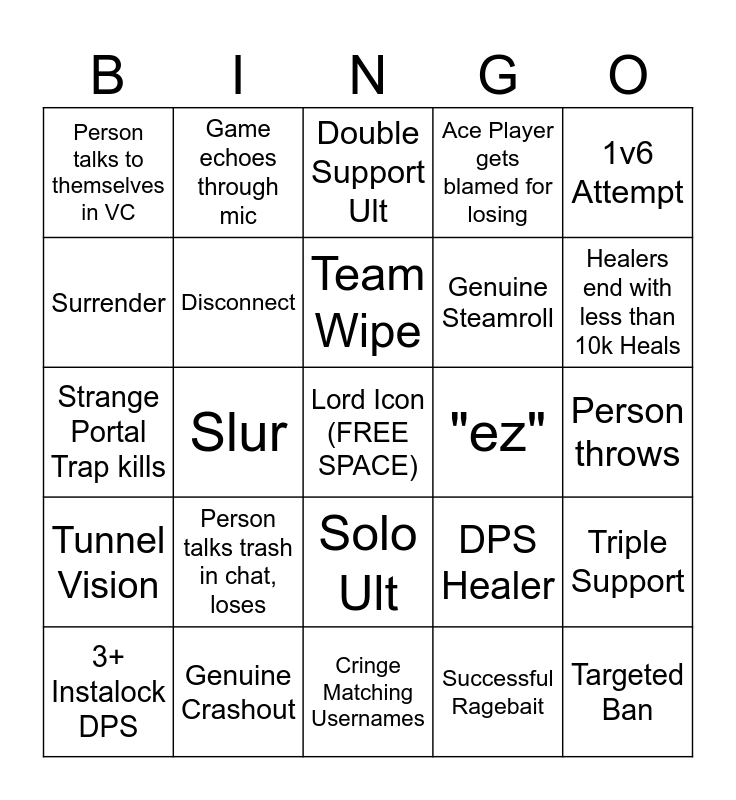 This bingo card has a free space and 29 words: 3+ Instalock DPS, "GGs" In the first round, Slur, "sybau", Person talks to themselves in VC, Double Support Ult, Disconnect, Person talks trash in chat, loses, "ez", Genuine Crashout, Person throws, Targeted Ban, Cringe Matching Usernames, Successful Ragebait, Healers end with less than 10k Heals, DPS end with negative KDR, Solo Ult, Tunnel Vision, 1v6 Attempt, Strange Portal Trap kills, DPS Healer, Inappropriate Username, Genuine Steamroll, Surrender, Ace Player gets blamed for losing, Game echoes through mic, Triple Support, Team Wipe and One Trick Gamer.