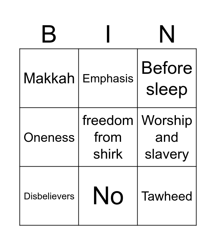 This bingo card has 9 words: Disbelievers, Before sleep, Emphasis, Oneness, Makkah, Worship and slavery, freedom from shirk, Tawheed and No.