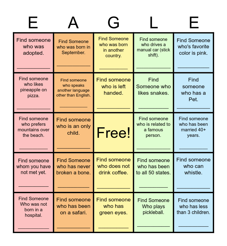 This bingo card has a free space and 25 words: Find Someone Who was not born in a hospital. ____________, Find Someone who has never broken a bone. ___________, Find someone who is left handed. ___________, Find Someone Who plays pickleball. ____________, Find someone who has a Pet. ___________, Find someone who was adopted. ___________, Find Someone who was born in September. _____________, Find Someone who was born in another country. ___________, Find Someone who likes snakes. __________, Find someone who can whistle. ___________, Find someone who prefers mountains over the beach. ___________, Find someone who speaks another language other than English. ____________, Find someone who has been to all 50 states. __________, Find someone who has less than 3 children. ___________, Find someone who likes pineapple on pizza. _____________, Find someone who has been on a safari. ___________, Find someone who has green eyes. __________, Find someone who drives a manual car (stick shift). ______________, Find someone who has been married 40+ years. ___________, Find someone whom you have not met yet. ___________, Find someone who is an only child. ___________, Find someone who does not drink coffee. ___________, Find someone who is related to a famous person. _____________, Find Someone who's favorite color is pink. ___________ and Find someone who is wearing a blue shirt. ____________.