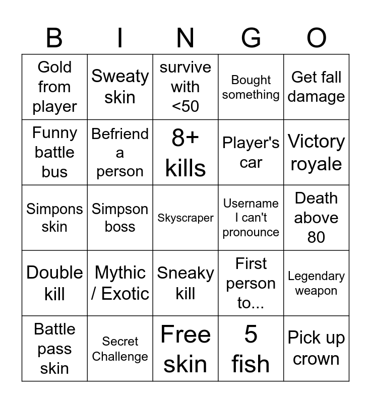 This bingo card has 28 words: Legendary weapon, Top 10, Player's car, 5 fish, Funny battle bus, survive with <50, Sweaty skin, Double kill, Username I can't pronounce, Battle pass skin, Simpons skin, Bought something, Secret Challenge, Free skin, Victory royale, Stupid death, Mythic / Exotic, Befriend a person, 8+ kills, Sneaky kill, Gold from player, Pick up crown, Skyscraper, Simpson boss, Death above 80, First person to..., Get fall damage and Get zone damage.