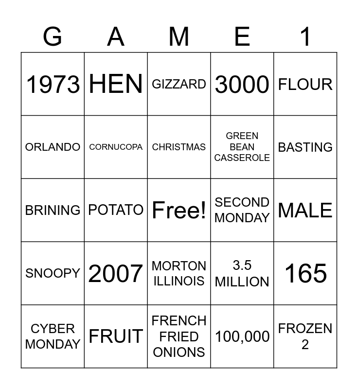 This bingo card has a free space and 29 words: CYBER MONDAY, ADAM SANDLER, POTATO, FOUR, 1973, GIZZARD, CORNUCOPA, 2007, SECOND MONDAY, FRUIT, MALE, FROZEN 2, FRENCH FRIED ONIONS, 100,000, BASTING, ORANGE, MORTON ILLINOIS, SNOOPY, FLOUR, BRINING, 3.5 MILLION, JELLY BEANS, GREEN BEAN CASSEROLE, ORLANDO, 3000, HEN, 165, CHRISTMAS and TOM.