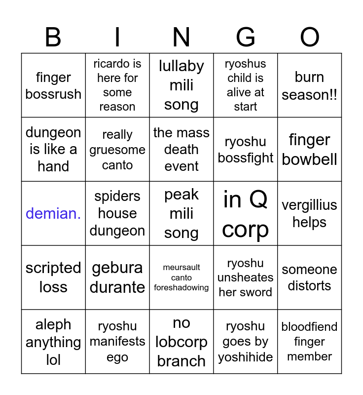 This bingo card has a free space and 24 words: gebura durante, ryoshu manifests ego, the mass death event, aleph anything lol, burn season!!, finger bossrush, dungeon is like a hand, ricardo is here for some reason, in Q corp, meursault canto foreshadowing, ryoshu bossfight, demian., ryoshu unsheates her sword, someone distorts, really gruesome canto, ryoshu goes by yoshihide, vergillius helps, lullaby mili song, finger bowbell, spiders house dungeon, bloodfiend finger member, scripted loss, ryoshus child is alive at start and no lobcorp branch.