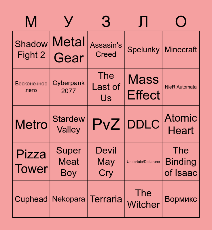This bingo card has a free space and 24 words: Super Meat Boy, Nekopara, The Last of Us, Cuphead, Minecraft, Shadow Fight 2, Бесконечное лето, Metal Gear, DDLC, Devil May Cry, Mass Effect, Metro, Undertale/Deltarune, The Binding of Isaac, Cyberpank 2077, The Witcher, Atomic Heart, Assasin's Creed, NieR:Automata, Stardew Valley, Вормикс, Pizza Tower, Spelunky and Terraria.