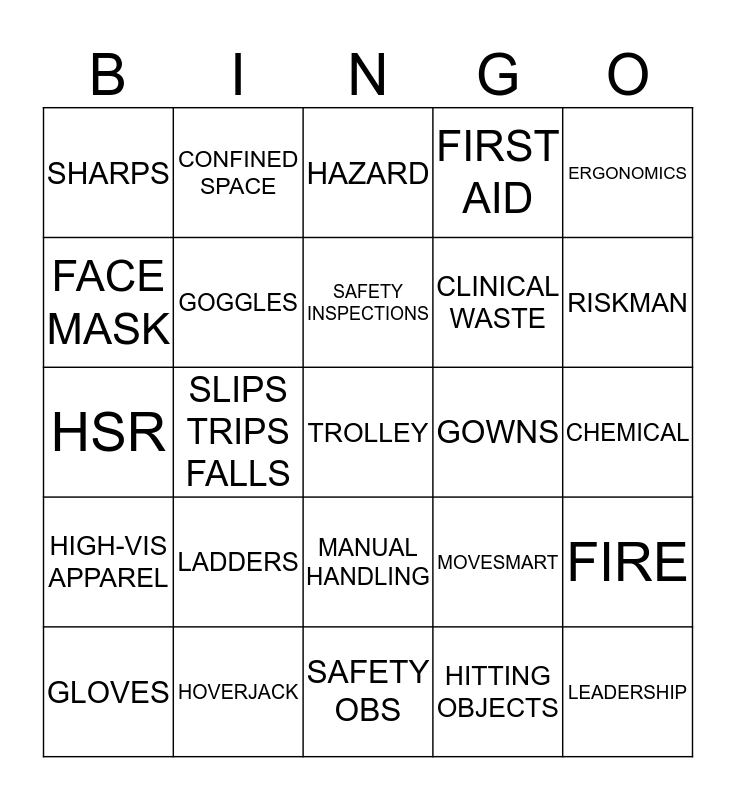 This bingo card has 25 words: LADDERS, SAFETY OBS, SAFETY INSPECTIONS, GLOVES, ERGONOMICS, SHARPS, FACE MASK, CONFINED SPACE, GOWNS, MANUAL HANDLING, CLINICAL WASTE, HSR, MOVESMART, FIRE, GOGGLES, LEADERSHIP, CHEMICAL, HAZARD, RISKMAN, SLIPS TRIPS FALLS, TROLLEY, HOVERJACK, HIGH-VIS APPAREL, FIRST AID and HITTING OBJECTS.