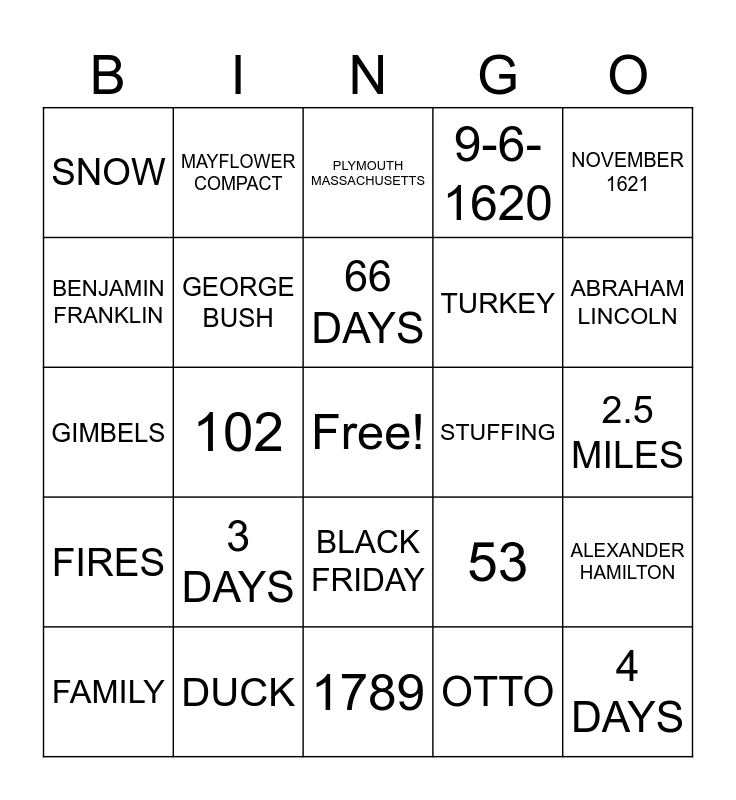 This bingo card has a free space and 29 words: FAMILY, FALSE, 102, WISCONSIN, SNOW, PLYMOUTH MASSACHUSETTS, GEORGE BUSH, 3 DAYS, STUFFING, DUCK, 2.5 MILES, 4 DAYS, 1789, OTTO, ABRAHAM LINCOLN, PASSEGERS ON THE MAYFLOWER, BLACK FRIDAY, FIRES, NOVEMBER 1621, GIMBELS, 53, SQUANTO, TURKEY, BENJAMIN FRANKLIN, 9-6-1620, MAYFLOWER COMPACT, ALEXANDER HAMILTON, 66 DAYS and 440.