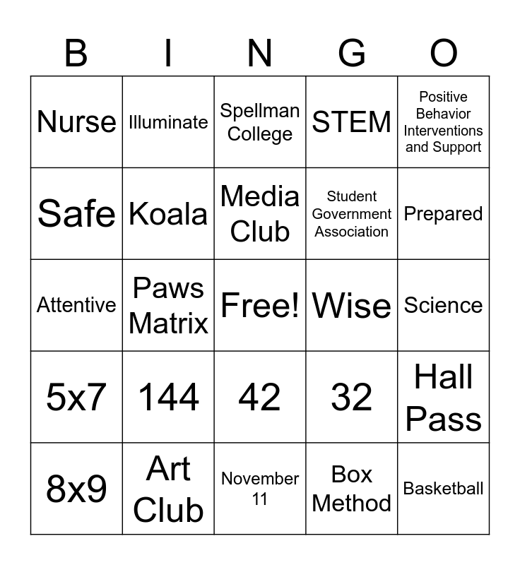 This bingo card has a free space and 24 words: 144, Art Club, Media Club, 8x9, Positive Behavior Interventions and Support, Nurse, Safe, Illuminate, Wise, 42, Student Government Association, Attentive, 32, Hall Pass, Koala, Box Method, Science, Spellman College, Prepared, Paws Matrix, Basketball, 5x7, STEM and November 11.