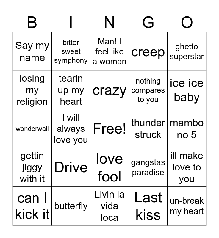 This bingo card has a free space and 73 words: No scrubs, I want it that way, Say my name, wannabe, hit me baby one more time, waterfalls, gettin jiggy with it, if you had my love, gangstas paradise, all the small things, always be my baby, jumpin jumpin, tearin up my heart, mambo no 5, smooth, bitter sweet symphony, Livin la vida loca, losing my religion, my own worst enemy, thunder struck, crazy, creep, ghetto superstar, whats my age again, can I kick it, My heart will go on, All star, Ready or not, truly madly deeply, kiss me, butterfly, genie in a bottle, Santeria, Two princes, I will always love you, good riddance, inside out, hero, un-break my heart, Because you loved me, Last kiss, Drive, You make me wanna, Killing me softly, dont speak, nothing compares to you, Man! I feel like a woman, I dont want to miss a thing, Believe, wonderwall, All that she wants, ALl my life, The sign, Another night, Gonna make you sweat, Loser, Friday Im in love, love fool, Boom boom boom boom, Be my lover, sweet dreams, baby got back, you cant touch this, ice ice baby, one week, this is how we do it, mmmbop, buddy holly, ill make love to you, macarena, Scar tissue, thank you and shes so high.