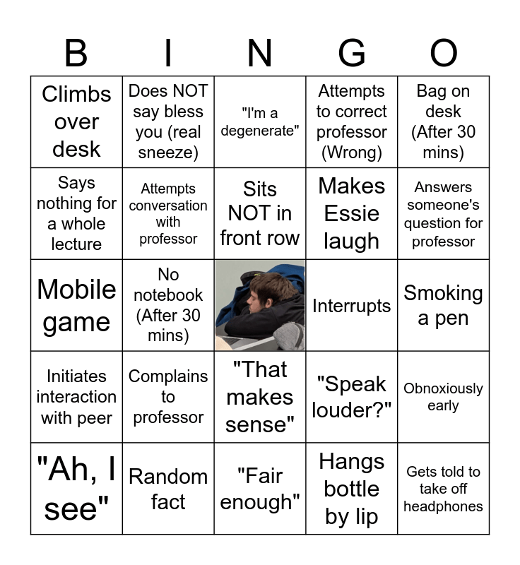 This bingo card has a free space and 33 words: Sits on floor, Fionn says "KILL YOURSELF", No notebook (After 30 mins), Knuckle deep in nose, Initiates interaction with peer, Attempts conversation with professor, Bag on desk (After 30 mins), "Ah, I see", Does NOT say bless you (real sneeze), "Uhm ackshually", Sits NOT in front row, "I'm a degenerate", Pokes Essie, Laughs obnoxiously loud, Interrupts, Answers someone's question for professor, Random fact, Mobile game, Complains to professor, "Speak louder?", "That makes sense", Gets told to shut up by professor, Climbs over desk, Smoking a pen, "Fair enough", Gets told to take off headphones, Attempts to correct professor (Wrong), Makes Essie laugh, Says nothing for a whole lecture, Obnoxiously early, Raises hand, Hangs bottle by lip and Professor sighs (at him).