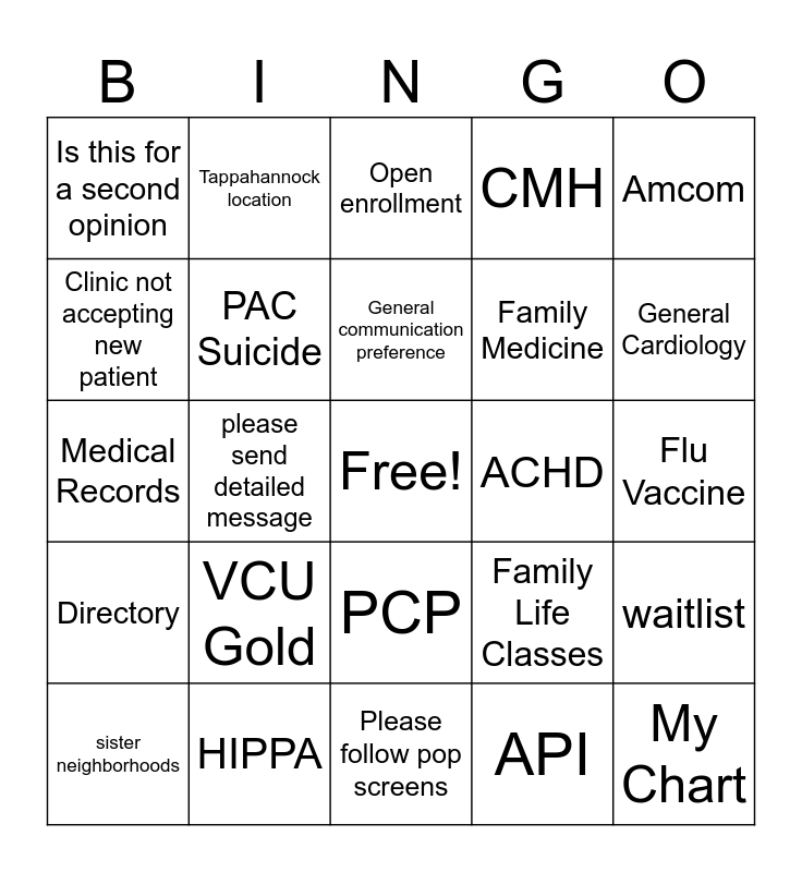 This bingo card has a free space and 29 words: sister neighborhoods, calling pt back, please send detailed message, PAC Abbreviations, Is this for a second opinion, Open enrollment, PAC Suicide, VCU Gold, ACHD, HIPPA, Flu Vaccine, My Chart, Please follow pop screens, API, General Cardiology, WFO, PCP, Directory, Amcom, Medical Records, Family Life Classes, Employee Health, Family Medicine, Clinic not accepting new patient, CMH, Tappahannock location, waitlist, General communication preference and I can't get into Epic.