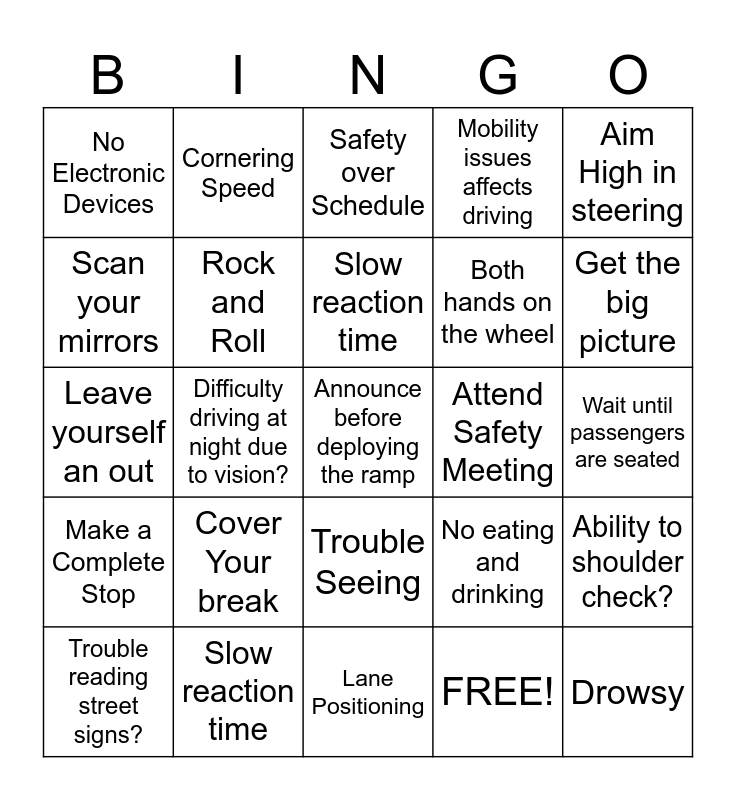 This bingo card has 30 words: Slow reaction time, Read Street Signs, Difficulty driving at night due to vision?, Side effects, No Electronic Devices, Safety over Schedule, Rock and Roll, Trouble Seeing, Attend Safety Meeting, Lane Positioning, Wait until passengers are seated, Announce before deploying the ramp, FREE!, Drowsy, Get the big picture, Seatbelt, No eating and drinking, Make a Complete Stop, Cover Your break, Aim High in steering, Leave yourself an out, Following Distance, Cornering Speed, Both hands on the wheel, Scan your mirrors, Mobility issues affects driving, Ability to shoulder check?, Trouble reading street signs?, Slow reaction time and Difficulty driving at night due to vision?.