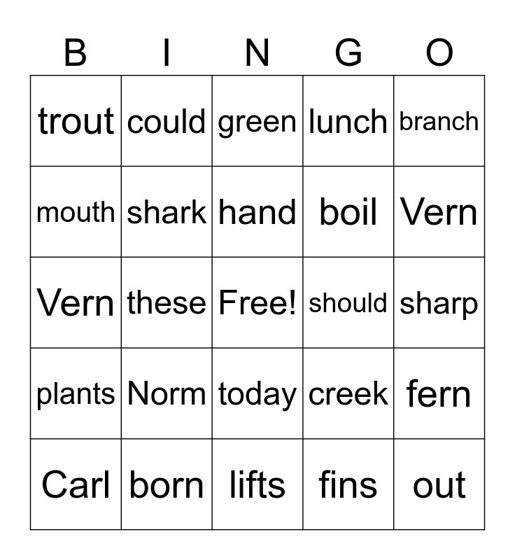 This bingo card has a free space and 24 words: Norm, born, hand, Carl, branch, trout, mouth, could, should, today, boil, Vern, creek, fern, shark, fins, sharp, green, Vern, these, out, plants, lunch and lifts.