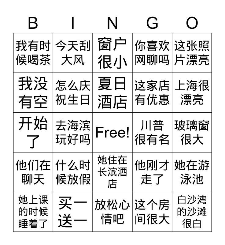 This bingo card has a free space and 24 words: 什么时候放假, 买一送一, 夏日酒店, 她上课的时候睡着了, 这张照片漂亮, 我有时候喝茶, 我没有空, 今天刮大风, 川普 很有名, 她住在长滨酒店, 这家店有优惠, 开始了, 他刚才走了, 她在游泳池, 怎么庆祝生日, 这个房间很大, 玻璃窗很大, 窗户很小, 上海很漂亮, 去海滨玩好吗, 白沙湾的沙滩很白, 他们在聊天, 你喜欢网聊吗 and 放松心情吧.