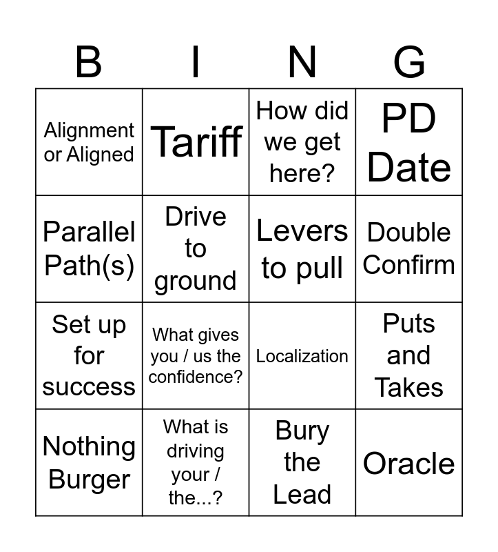 This bingo card has 16 words: Nothing Burger, What is driving your / the...?, How did we get here?, PD Date, Parallel Path(s), Tariff, Localization, Puts and Takes, Alignment or Aligned, Drive to ground, Bury the Lead, Double Confirm, Set up for success, What gives you / us the confidence?, Levers to pull and Oracle.
