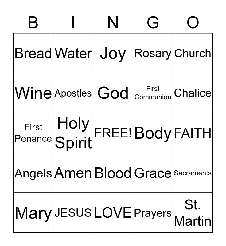 This bingo card has a free space and 24 words: Amen, JESUS, God, Mary, Church, Bread, Wine, Water, Body, Blood, First Communion, First Penance, Grace, Sacraments, Apostles, Prayers, FAITH, Joy, Chalice, Holy Spirit, St. Martin, Angels, Rosary and LOVE.