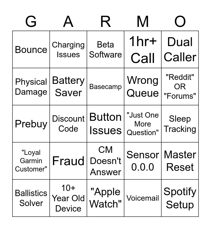 This bingo card has a free space and 24 words: Fraud, 10+ Year Old Device, Basecamp, Ballistics Solver, Dual Caller, Bounce, Physical Damage, Charging Issues, "Just One More Question", CM Doesn't Answer, Wrong Queue, Prebuy, Sensor 0.0.0, Master Reset, Battery Saver, Voicemail, Sleep Tracking, Beta Software, "Reddit" OR "Forums", Discount Code, Spotify Setup, "Loyal Garmin Customer", 1hr+ Call and "Apple Watch".