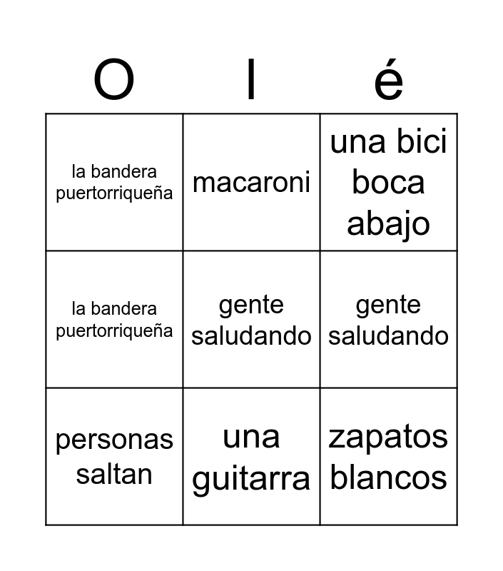 ⚠ This card has duplicate items: la palabra «gracias» (2), pistolas de agua (2), macaroni (2), una guitarra (2), dominoes (2), la bandera puertorriqueña (2), una bici boca abajo (2)