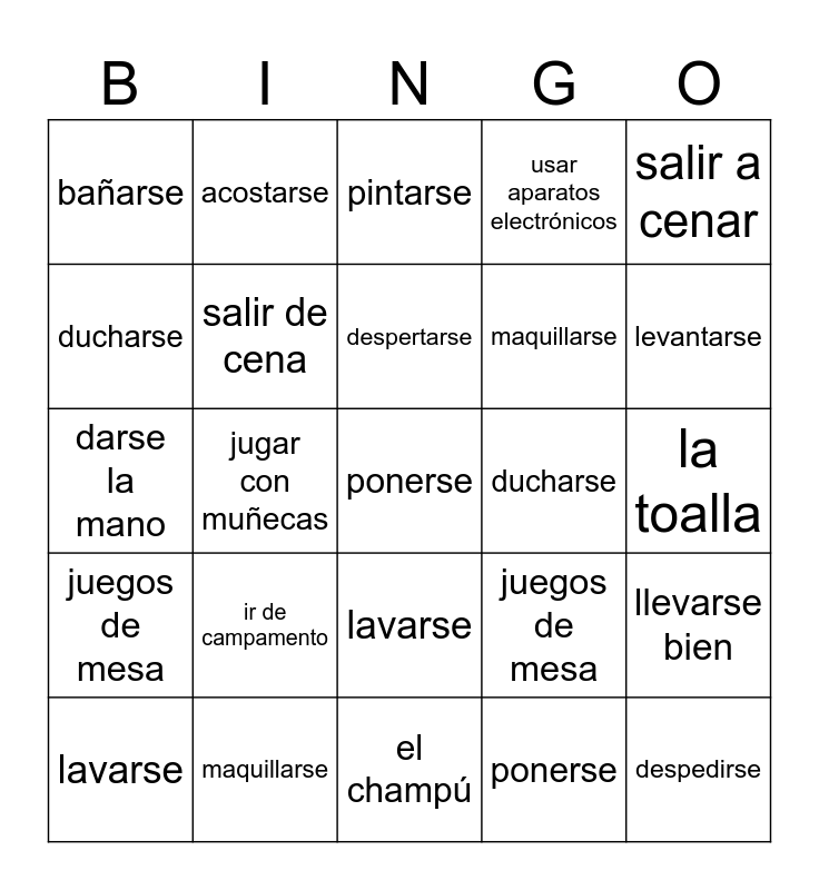 ⚠ This card has duplicate items: vestirse (2), el jabón (3), llevarse bien (2), cepillarse (2), pelearse (2), acostarse (2), saludarse (2), despertarse (2), levantarse (2), lavarse (2), ir de caminata (2), la toalla (2), darse la mano (2), ducharse (2), jugar con muñecas (2), bañarse (2), despedirse (2), maquillarse (2), ir de campamento (2), juegos de mesa (2), usar aparatos electrónicos (2), secarse (2)