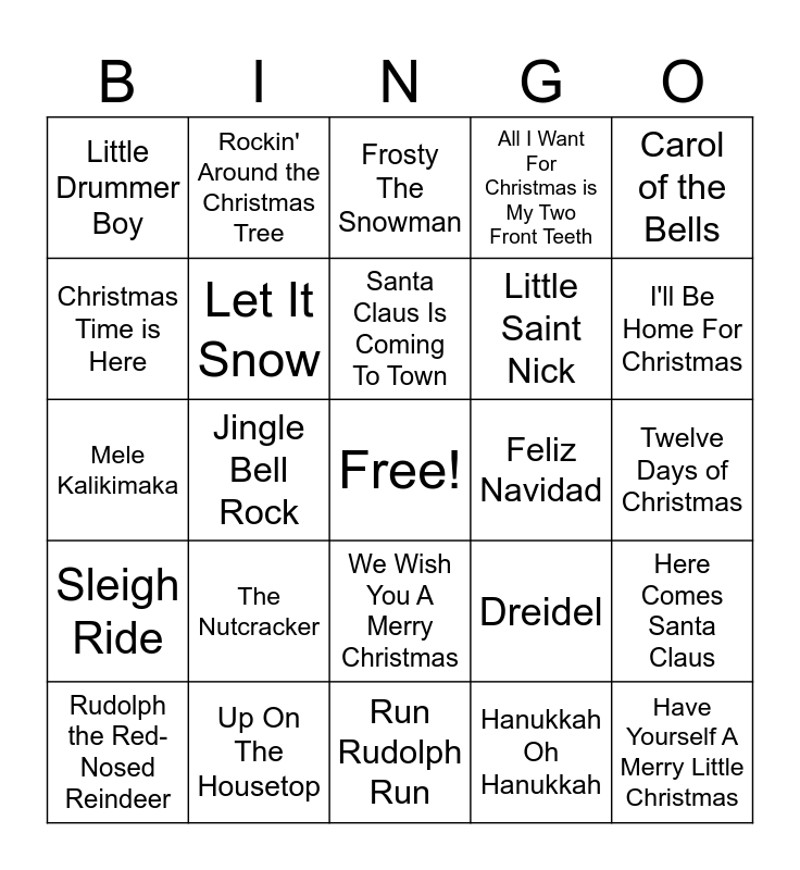 This bingo card has a free space and 29 words: Rudolph the Red-Nosed Reindeer, Deck The Hall, Jingle Bell Rock, I Want A Hippopotamus For Christmas, Little Drummer Boy, Frosty The Snowman, Let It Snow, The Nutcracker, Feliz Navidad, Up On The Housetop, Twelve Days of Christmas, Have Yourself A Merry Little Christmas, Run Rudolph Run, Hanukkah Oh Hanukkah, I'll Be Home For Christmas, White Christmas, We Wish You A Merry Christmas, Sleigh Ride, Carol of the Bells, Mele Kalikimaka, Dreidel, You're A Mean One Mr. Grinch, Little Saint Nick, Christmas Time is Here, All I Want For Christmas is My Two Front Teeth, Rockin' Around the Christmas Tree, Here Comes Santa Claus, Santa Claus Is Coming To Town and Winter Wonderland.