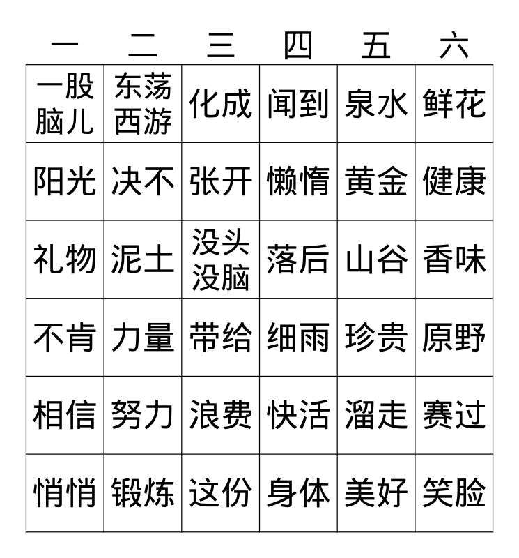 This bingo card has 44 words: 时光, 礼物, 东风, 带给, 快活, 原野, 化成, 清清的, 泉水, 细雨, 闻到, 泥土, 香味, 山谷, 这份, 珍贵, 赛过, 黄金, 安排, 懒惰, 东荡西游, 悄悄, 溜走, 一股脑儿, 糊涂, 没头没脑, 努力, 少年, 不肯, 落后, 知识, 力量, 锻炼, 身体, 健康, 浪费, 美好, 相信, 决不, 鲜花, 张开, 笑脸, 阳光 and 积雪.