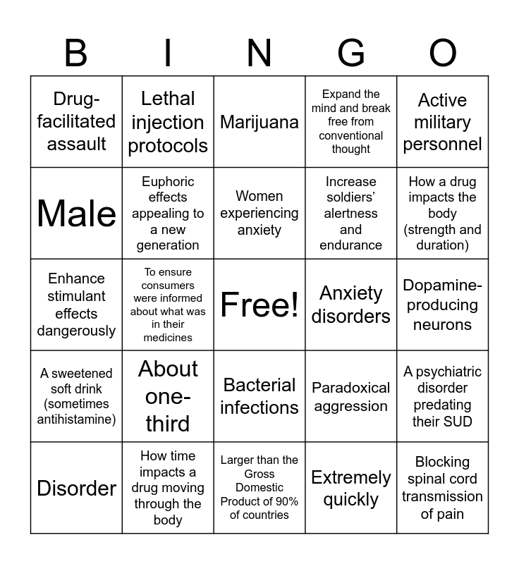 This bingo card has a free space and 24 words: About one-third, How time impacts a drug moving through the body, Women experiencing anxiety, Disorder, Active military personnel, Drug-facilitated assault, Male, Lethal injection protocols, Anxiety disorders, Bacterial infections, Increase soldiers’ alertness and endurance, Enhance stimulant effects dangerously, Paradoxical aggression, A psychiatric disorder predating their SUD, Euphoric effects appealing to a new generation, Extremely quickly, Dopamine-producing neurons, Marijuana, How a drug impacts the body (strength and duration), To ensure consumers were informed about what was in their medicines, Blocking spinal cord transmission of pain, A sweetened soft drink (sometimes antihistamine), Expand the mind and break free from conventional thought and Larger than the Gross Domestic Product of 90% of countries.