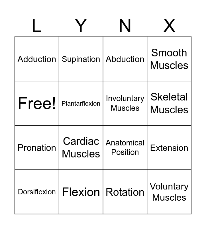 This bingo card has 16 words: Flexion, Extension, Abduction, Adduction, Pronation, Supination, Anatomical Position, Rotation, Free!, Plantarflexion, Dorsiflexion, Smooth Muscles, Cardiac Muscles, Skeletal Muscles, Involuntary Muscles and Voluntary Muscles.