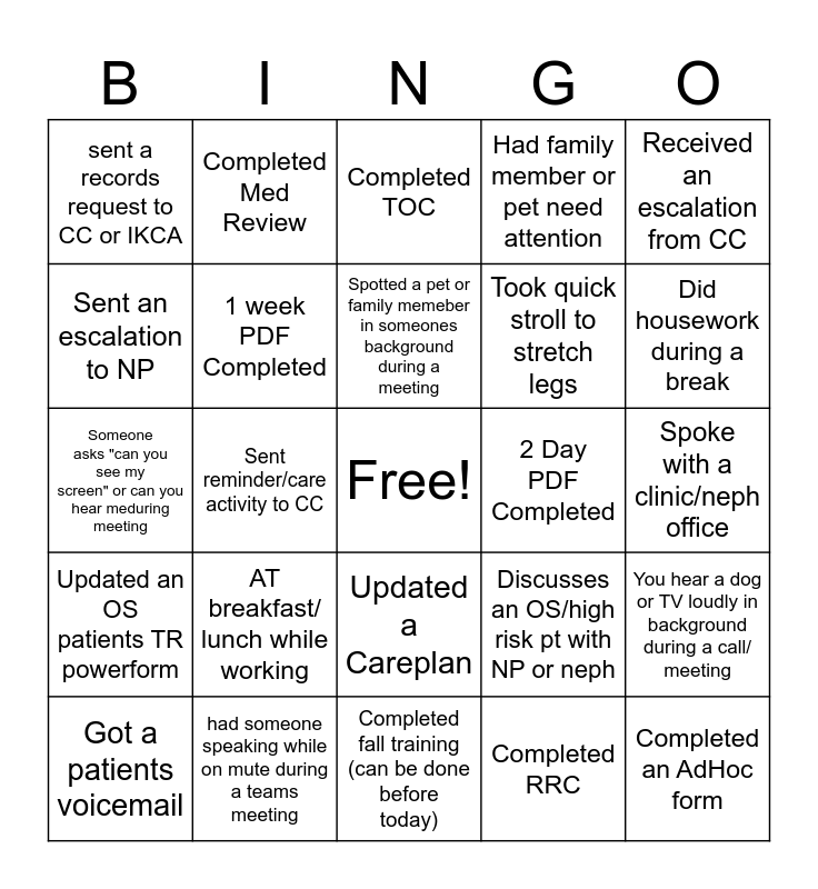 This bingo card has a free space and 24 words: AT breakfast/ lunch while working, had someone speaking while on mute during a teams meeting, Spotted a pet or family memeber in someones background during a meeting, Got a patients voicemail, Received an escalation from CC, sent a records request to CC or IKCA, Sent an escalation to NP, Completed Med Review, 2 Day PDF Completed, Updated a Careplan, Took quick stroll to stretch legs, Someone asks "can you see my screen" or can you hear meduring meeting, Discusses an OS/high risk pt with NP or neph, You hear a dog or TV loudly in background during a call/ meeting, 1 week PDF Completed, Completed RRC, Spoke with a clinic/neph office, Completed TOC, Did housework during a break, Sent reminder/care activity to CC, Completed an AdHoc form, Updated an OS patients TR powerform, Had family member or pet need attention and Completed fall training (can be done before today).