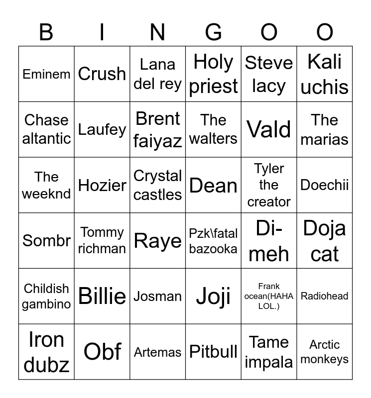 This bingo card has 36 words: Joji, Josman, Pitbull, Chase altantic, Sombr, Dean, Laufey, Artemas, Steve lacy, Frank ocean(HAHA LOL.), The marias, Holy priest, Radiohead, Hozier, The walters, Eminem, Childish gambino, Tyler the creator, The weeknd, Lana del rey, Crystal castles, Tommy richman, Pzk\fatal bazooka, Raye, Di-meh, Crush, Vald, Obf, Brent faiyaz, Kali uchis, Arctic monkeys, Iron dubz, Doja cat, Doechii, Billie and Tame impala.