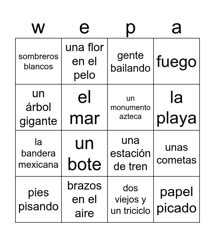 This bingo card has 19 words: una estación de tren, el número 1, gente bailando, papel picado, unas cometas, un árbol gigante, dos viejos y un triciclo, sombreros blancos, una flor en el pelo, la bandera mexicana, un bote, el mar, un monumento azteca, brazos en el aire, pies pisando, cerveza, fuego, la playa and un atardecer.