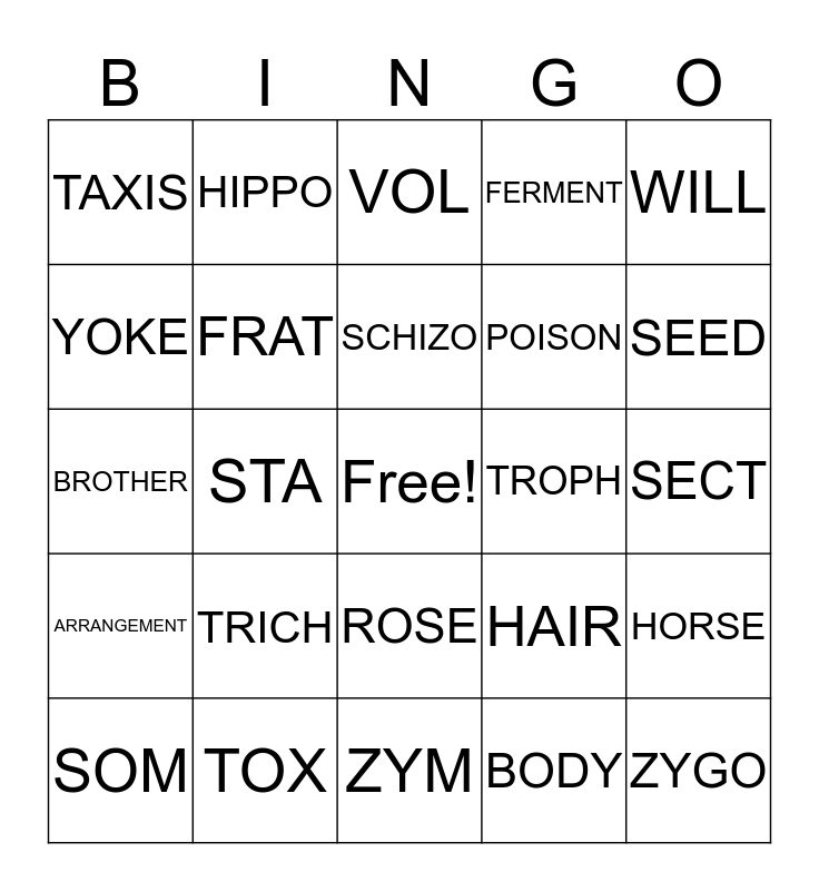 This bingo card has a free space and 29 words: SOM, SPOR, STA, RHODO, TAXIS, VOL, FRAT, TRICH, TROPH, TOX, SECT, ZYGO, ZYM, BODY, SEED, STOP, ROSE, ARRANGEMENT, WILL, BROTHER, HAIR, NOURISHMENT, POISON, YOKE, FERMENT, HIPPO, HORSE, SCHIZO and DIVIDE.