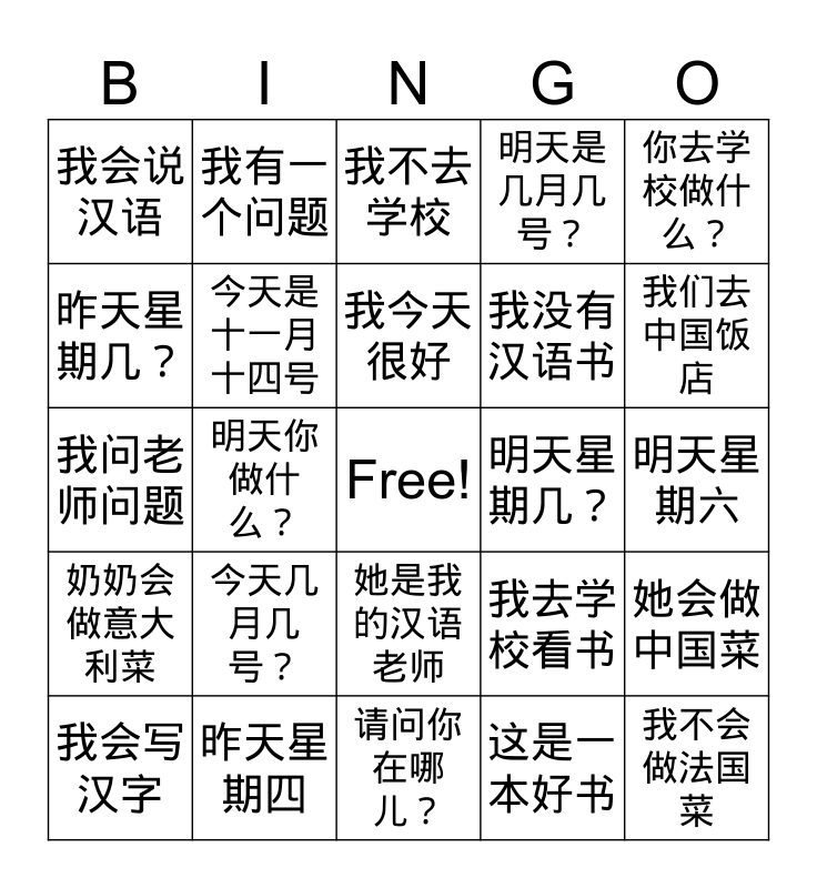 This bingo card has a free space and 24 words: 今天几月几号?, 昨天星期四, 我今天很好, 我会写汉字, 你去学校做什么?, 我会说汉语, 昨天星期几?, 我有一个问题, 明天星期几?, 她是我的汉语老师, 我没有汉语书, 我问老师问题, 我去学校看书, 她会做中国菜, 今天是十一月十四号, 这是一本好书, 明天星期六, 我不去学校, 我们去中国饭店, 明天你做什么?, 我不会做法国菜, 奶奶会做意大利菜, 明天是几月几号? and 请问你在哪儿?.