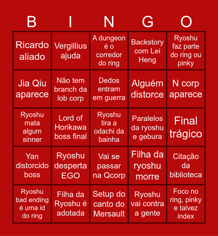 This bingo card has a free space and 24 words: Ryoshu desperta EGO, Filha da Ryoshu é adotada, Dedos entram em guerra, Ryoshu bad ending é uma id do ring, Ryoshu faz parte do ring ou pinky, Ricardo aliado, Jia Qiu aparece, Vergillius ajuda, Paralelos da ryoshu e gebura, Vai se passar na Qcorp, Alguém distorce, Ryoshu mata algum sinner, Filha da ryoshu morre, Citação da biblioteca, Não tem branch da lob corp, Ryoshu vai contra a gente, Final trágico, A dungeon é o corredor do ring, N corp aparece, Lord of Horikawa boss final, Foco no ring, pinky e talvez index, Yan distorcido boss, Backstory com Lei Heng and Setup do canto do Mersault.