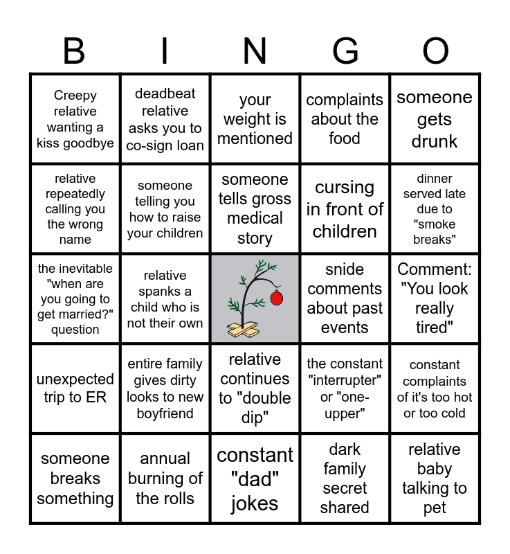 This bingo card has a free space and 34 words: toilet backs up, dark family secret shared, relative's dog vomits on carpet, relative calling current spouse by ex's name, unexpected trip to ER, someone telling you how to raise your children, someone gets drunk, someone breaks something, deadbeat relative asks you to co-sign loan, fist fight over politics, someone tells gross medical story, your weight is mentioned, toddler pees on floor, teen with attitude on phone entire time, snide comments about past events, dinner served late due to "smoke breaks", annual burning of the rolls, the inevitable "when are you going to get married?" question, entire family gives dirty looks to new boyfriend, the constant "interrupter" or "one-upper", relative continues to "double dip", Comment: "if you would only come around more often", Creepy relative wanting a kiss goodbye, Comment: "You look really tired", constant "dad" jokes, relative baby talking to pet, complaints about the food, you are asked to fix relative's phone or computer, cursing in front of children, relative repeatedly calling you the wrong name, awkward silence during dinner, relative spanks a child who is not their own, constant complaints of it's too hot or too cold and football game on entirely too loud.