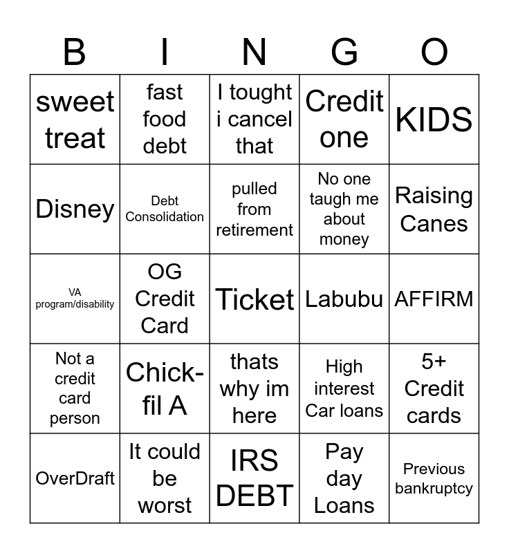 This bingo card has a free space and 24 words: Chick-fil A, It could be worst, pulled from retirement, OverDraft, KIDS, sweet treat, Disney, fast food debt, Labubu, thats why im here, No one taugh me about money, VA program/disability, High interest Car loans, 5+ Credit cards, Debt Consolidation, Pay day Loans, AFFIRM, I tought i cancel that, Raising Canes, OG Credit Card, Previous bankruptcy, Not a credit card person, Credit one and IRS DEBT.