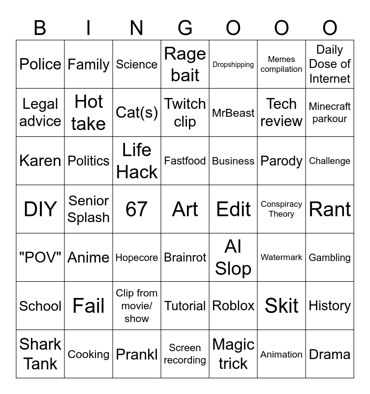 This bingo card has a free space and 62 words: Reddit thread, DIY, Beginner vs Expert, Politics, Drama, History, Daily Dose of Internet, VTuber, Hot take, Shark Tank, Rage bait, Tutorial, Memes compilation, Edit, Sport, Police, Tech review, Dropshipping, Japan Legal, Legal advice, Minecraft parkour, Science, Challenge, 67, Giving to the Homeless, AI Slop, Anime, Language, Parody, Gambling, Subway Surfers, Clip from movie/ show, Animation, "Satisfying", Karen, Family, Roblox, Watermark, MrBeast, Conspiracy Theory, Twitch clip, Skit, Life Hack, Judge/ court, Cat(s), Business, Hopecore, Cooking, Screen recording, Magic trick, Fastfood, Senior Splash, Couple, Fail, Filters, Rant, Brainrot, School, Prankl, Silent "react", "POV" and Live.