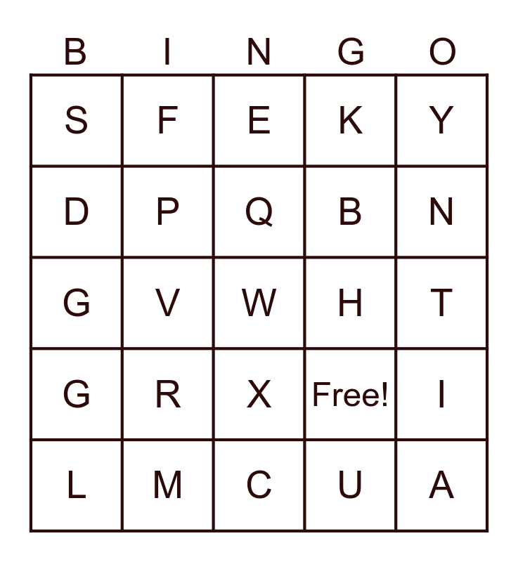 This bingo card has 27 words: Free!, A, B, C, D, E, F, G, H, I, G, K, L, M, N, O, P, Q, R, S, T, U, V, W, X, Y and Z.