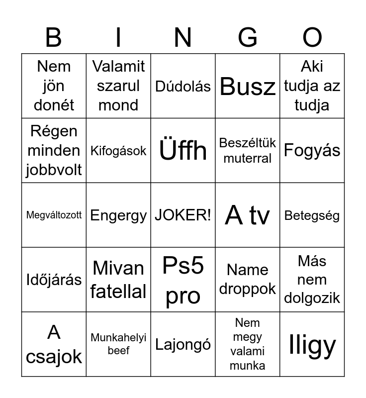This bingo card has a free space and 24 words: Mivan fatellal, Munkahelyi beef, Üffh, A csajok, Aki tudja az tudja, Nem jön donét, Régen minden jobbvolt, Valamit szarul mond, A tv, Ps5 pro, Beszéltük muterral, Megváltozott, Name droppok, Más nem dolgozik, Kifogások, Nem megy valami munka, Betegség, Dúdolás, Fogyás, Engergy, Iligy, Időjárás, Busz and Lajongó.
