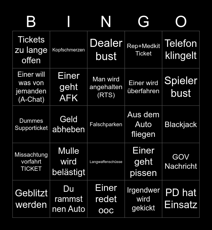 This bingo card has 25 words: Mulle wird belästigt, Einer redet ooc, Man wird angehalten (RTS), Geblitzt werden, Telefon klingelt, Tickets zu lange offen, Einer will was von jemanden (A-Chat), Kopfschmerzen, Aus dem Auto fliegen, Langwaffenschüsse, Einer wird überfahren, Dummes Supporticket, Einer geht pissen, GOV Nachricht, Einer geht AFK, PD hat Einsatz, Blackjack, Dealer bust, Spieler bust, Geld abheben, Falschparken, Du rammst nen Auto, Missachtung vorfahrt TICKET, Rep+Medkit Ticket and Irgendwer wird gekickt.