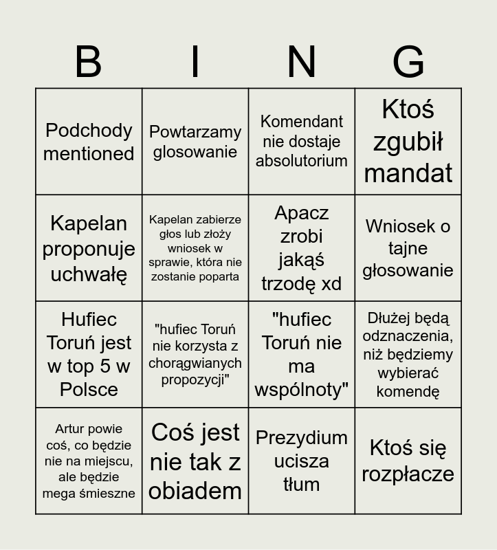 This bingo card has 20 words: Dłużej będą odznaczenia, niż będziemy wybierać komendę, Ktoś z komendy nie dostaje absolutorium, Komendant nie dostaje absolutorium, Beata będzie mydlić oczy, Artur powie coś, co będzie nie na miejscu, ale będzie mega śmieszne, Kapelan proponuje uchwałę, Coś jest nie tak z obiadem, Podchody mentioned, Hufiec Toruń jest w top 5 w Polsce, Powtarzamy glosowanie, "hufiec Toruń nie korzysta z chorągwianych propozycji", "hufiec Toruń nie ma wspólnoty", Kapelan zabierze głos lub złoży wniosek w sprawie, która nie zostanie poparta, Ktoś się rozpłacze, Apacz zrobi jakąś trzodę xd, Ktoś poruszy temat, że składki są za wysokie, Wniosek o tajne głosowanie, Ktoś zgubił mandat, Prezydium ucisza tłum and Nie wiadomo ile powinno być głosów.