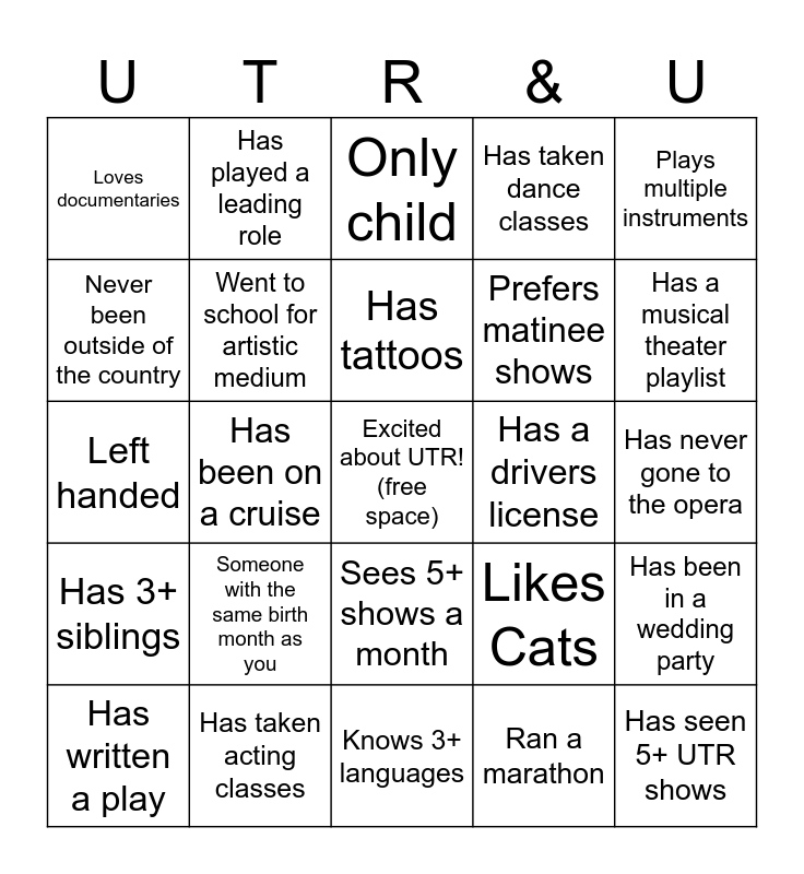 This bingo card has a free space and 50 words: This is their first UTR!, Has seen 5+ UTR shows, Born in NYC, Knows 3+ languages, Someone with the same birth month as you, Never performed onstage, Has played a leading role, Never flown on an airplane, Never been outside of the country, Named after a relative, Went to school for artistic medium, Has taken dance classes, Has been in a wedding party, Likes Cats, Moved in the last year, Has seen an outdoor performance, Has tattoos, Has a drivers license, Has done stand-up comedy, Plays multiple instruments, Has been on a cruise, Ran a marathon, Loves documentaries, Prefers matinee shows, UTR staff member, Drinks 3+ cups of coffee a day, Has a musical theater playlist, Born outside the US, Only child, Sees 5+ shows a month, Has worked in the tech booth, Loves rollercoasters, Twin or Triplet, Has seen a performance outside the country, Has taken acting classes, Has worked in the industry for 10+ years, Lived in another country, Has been on a podcast, Read 10+ books this year, Has never gone to the opera, Has a cat, Has a dog, Has an unconventional pet, Lives with roommates, Has written a play, Left handed, Has been to a circus, Has been to a concert in the last month, Has 3+ siblings and Has been in a band.