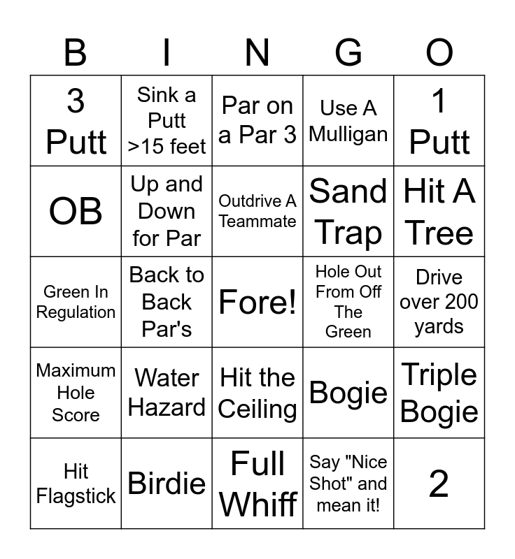 This bingo card has a free space and 24 words: Water Hazard, Birdie, Outdrive A Teammate, Hit Flagstick, 1 Putt, 3 Putt, OB, Sink a Putt >15 feet, Hole Out From Off The Green, Hit the Ceiling, Sand Trap, Green In Regulation, Bogie, Triple Bogie, Up and Down for Par, Say "Nice Shot" and mean it!, Drive over 200 yards, Par on a Par 3, Hit A Tree, Back to Back Par's, 2, Maximum Hole Score, Use A Mulligan and Full Whiff.