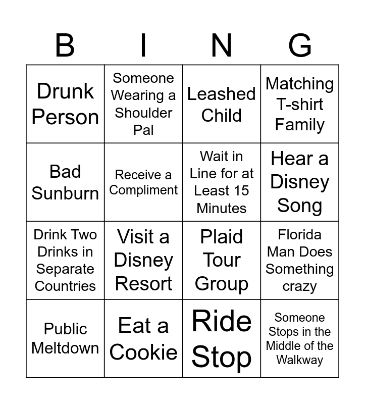 This bingo card has 16 words: Eat a Cookie, Florida Man Does Something crazy, Leashed Child, Drunk Person, Drink Two Drinks in Separate Countries, Someone Wearing a Shoulder Pal, Plaid Tour Group, Ride Stop, Bad Sunburn, Receive a Compliment, Public Meltdown, Matching T-shirt Family, Visit a Disney Resort, Hear a Disney Song, Wait in Line for at Least 15 Minutes and Someone Stops in the Middle of the Walkway.