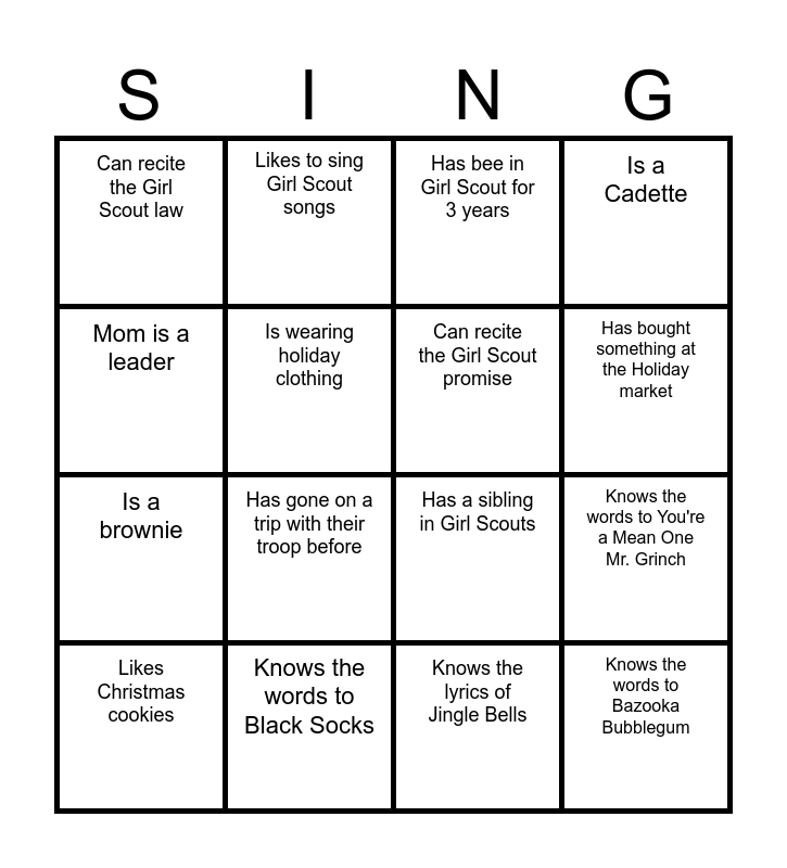 This bingo card has 21 words: Knows the words to Black Socks, Can tell you Juliet Gordon Low's birthday, Likes to sing Girl Scout songs, Favorite holiday is in December, Knows the lyrics of Jingle Bells, Can recite the Girl Scout promise, Can recite the Girl Scout law, Has bee in Girl Scout for 3 years, Has a sibling in Girl Scouts, Has bought something at the Holiday market, Is a brownie, Is a Cadette, Knows the words to Bazooka Bubblegum, Has been to Girl Scout camp, Is wearing holiday clothing, Favorite Girl Scout cookie is Thin Mints, Likes Christmas cookies, Has gone on a trip with their troop before, Mom is a leader, Knows the words to You're a Mean One Mr. Grinch and Who prefers Halloween over Christmas.