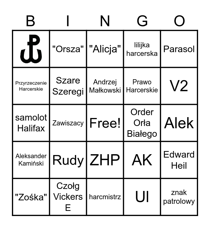 This bingo card has 1 images, a free space and 32 words: Grupy Szturmowe, Bojowe Szkoły, Zawiszacy, Agricola, Aleksander Kamiński, Szare Szeregi, Parasol, "Zośka", "Orsza", "Jan Bugaj"/"Emil", Andrzej Małkowski, "Alicja", "Nil", Tadeusz Bor-Komorowski, Order Orła Białego, V2, Czołg Vickers E, samolot Halifax, Rudy, AK, ZHP, Virtuti Militari, Alek, harcmistrz, znak patrolowy, lilijka harcerska, Prawo Harcerskie, Przyrzeczenie Harcerskie, Edward Heil, dziś-jutro-pojutrze, Ul and Pasieka.