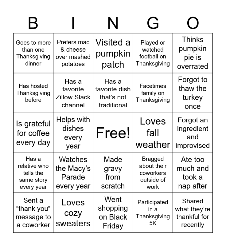 This bingo card has a free space and 67 words: Loves stuffing more than turkey, Thinks cranberry sauce is underrated, Baked a pie from scratch, Ate too much and took a nap after, Has a secret family recipe, Tried deep-fried turkey, Prefers mac & cheese over mashed potatoes, Loves leftovers more than the actual meal, Has a favorite dish that’s not traditional, Burned something in the oven before, Made gravy from scratch, Tried to be “healthy” and failed, Forgot an ingredient and improvised, Thinks pumpkin pie is overrated, Can’t imagine Thanksgiving without bread rolls, Has hosted Thanksgiving before, Helps with dishes every year, Goes to more than one Thanksgiving dinner, Has a “Friendsgiving” tradition, Facetimes family on Thanksgiving, Watches the Macy’s Parade every year, Has a relative who tells the same story every year, Played or watched football on Thanksgiving, Participated in a Thanksgiving 5K, Watches “A Charlie Brown Thanksgiving”, Wore matching family outfits, Has a designated “kids’ table” in the family, Tried a new dish and it was a hit, Forgot to thaw the turkey once, Has a Thanksgiving playlist, Shared what they’re thankful for recently, Volunteered or donated food this season, Complimented someone today, Wrote a gratitude list this year, Said “I’m thankful for this team”, Sent a “thank you” message to a coworker, Helped someone at work this week, Bragged about their coworkers outside of work, Is grateful for coffee every day, Is thankful for flexible work-from-home days, Worked on Thanksgiving once, Has a favorite Zillow Slack channel, Loves fall weather, Drank something pumpkin-spiced, Decorated for fall, Jumped in a pile of leaves (recently or as a kid), Has a favorite fall candle scent, Loves cozy sweaters, Took a fall foliage photo, Has a favorite fall movie, Visited a pumpkin patch, Carved a pumpkin this year, Said “I’m stuffed” unironically, Forgot what day it was during the holiday week, Fell asleep during a movie, Went shopping on Black Friday, Got distracted by dessert, Had to unbutton their pants after eating, Took home leftovers in Tupperware, Took a “food coma” nap, Wore stretchy pants intentionally, Argued over what counts as a casserole, Watched a Hallmark movie, Accidentally called it “Christmas” dinner, Took a cute pet photo for Thanksgiving, Made a pun about “gravy” or “turkey” and Said “Gobble Gobble” out loud today.