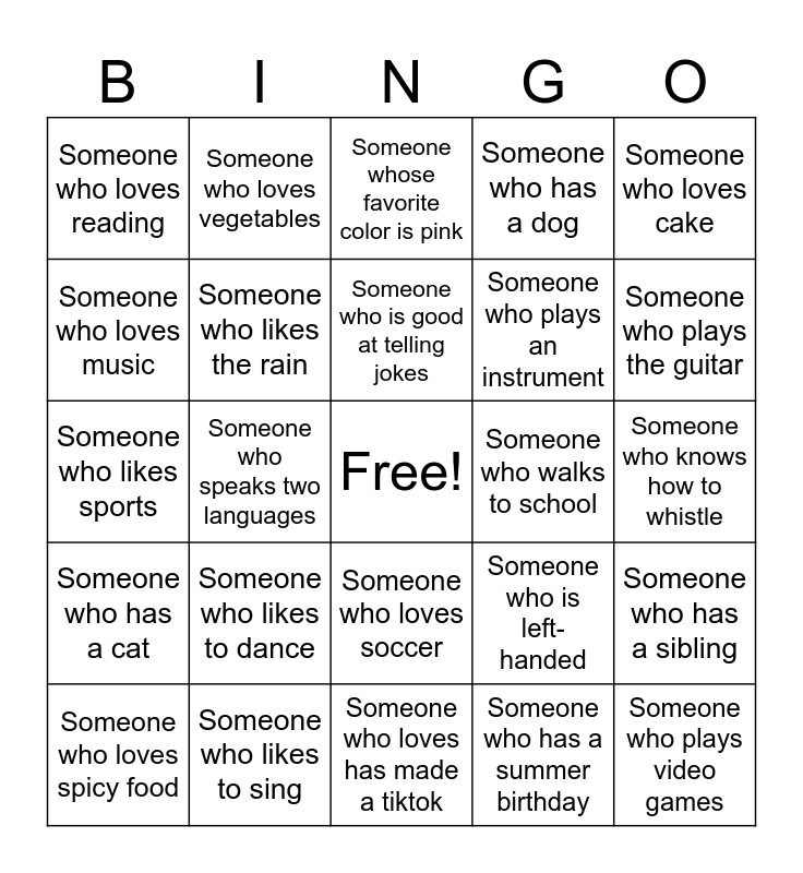 This bingo card has a free space and 25 words: Someone who likes to dance, Someone who loves has made a tiktok, Someone who is good at telling jokes, Someone who loves spicy food, Someone who loves cake, Someone who loves reading, Someone who loves music, Someone who loves vegetables, Someone who walks to school, Someone who loves soccer, Someone who plays an instrument, Someone who likes sports, Someone who is left-handed, Someone who has a sibling, Someone who likes the rain, Someone who likes cooking, Someone who knows how to whistle, Someone whose favorite color is pink, Someone who plays the guitar, Someone who speaks two languages, Someone who plays video games, Someone who likes to sing, Someone who has a cat, Someone who has a dog and Someone who has a summer birthday.