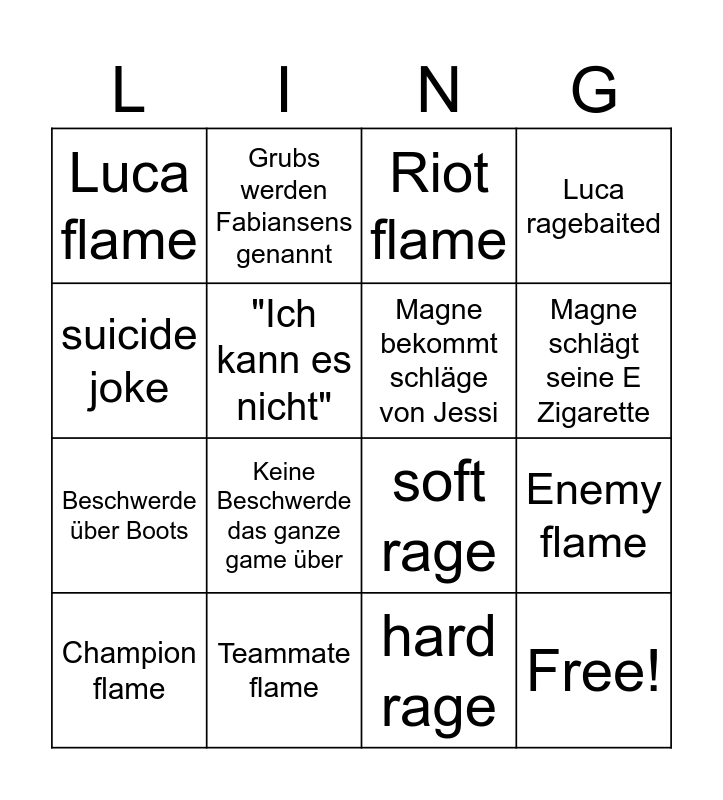 This bingo card has 16 words: Teammate flame, Enemy flame, Riot flame, Luca flame, Beschwerde über Boots, Grubs werden Fabiansens genannt, soft rage, hard rage, suicide joke, "Ich kann es nicht", Champion flame, Luca ragebaited, Keine Beschwerde das ganze game über, Magne schlägt seine E Zigarette, Magne bekommt schläge von Jessi and Free!.