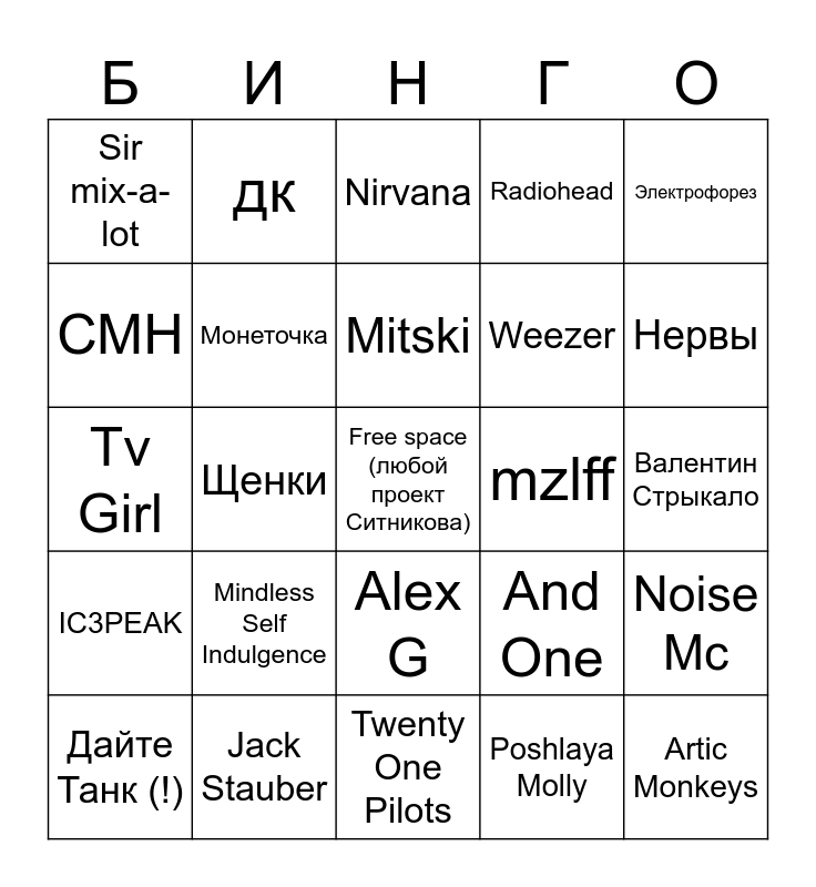 This bingo card has a free space and 24 words: Mindless Self Indulgence, Jack Stauber, Mitski, Дайте Танк (!), Электрофорез, Sir mix-a-lot, СМН, дк, mzlff, Alex G, Weezer, Tv Girl, And One, Noise Mc, Монеточка, Poshlaya Molly, Валентин Стрыкало, Nirvana, Нервы, Щенки, Artic Monkeys, IC3PEAK, Radiohead and Twenty One Pilots.